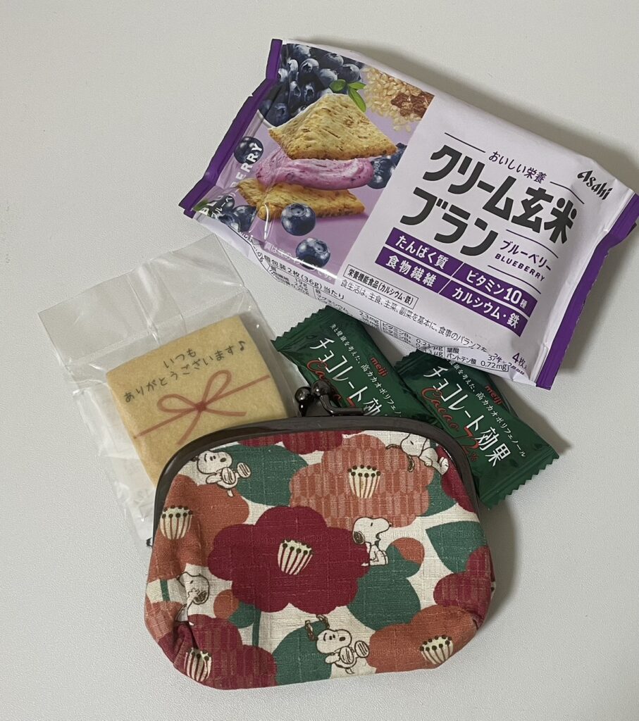 そんな時に役立ったのが、持ってきていた非常食たちでした。胃が空っぽになると空腹胃痛で吐き気に襲われる対策として、お腹に溜まる軽食やクッキーなどを持ってきていたのです。