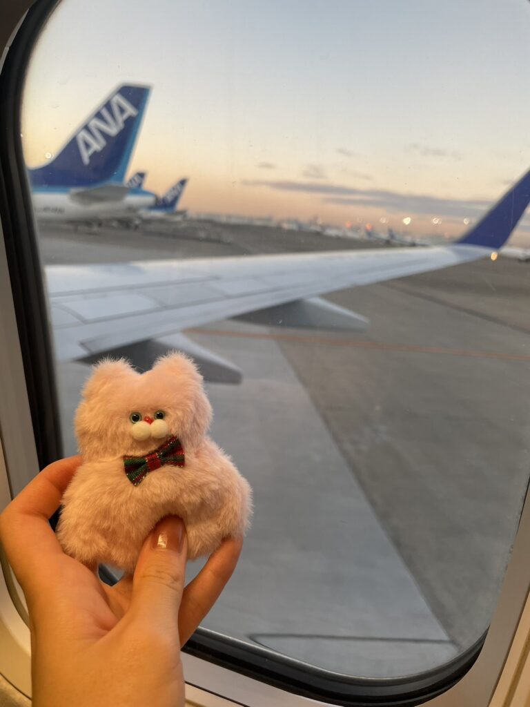吉祥寺で買ったぬいぐるみと、羽田空港にて。